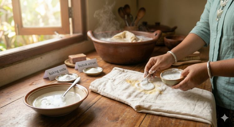 Ketiga bahan ini bekerja secara sinergis: sabun cuci piring memecah noda, baking soda mengangkat kotoran, dan sitrun mencerahkan warna kain kembali. Tidak ada bahan kimia keras, tidak ada risiko serat rusak.